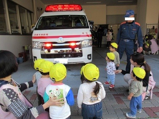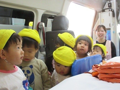 今週は消防署見学に行きました。目の前で見る消防車も救急車も迫力満点。はたらくくるまが大好きなお友だちは目をまんまるにして大興奮です。