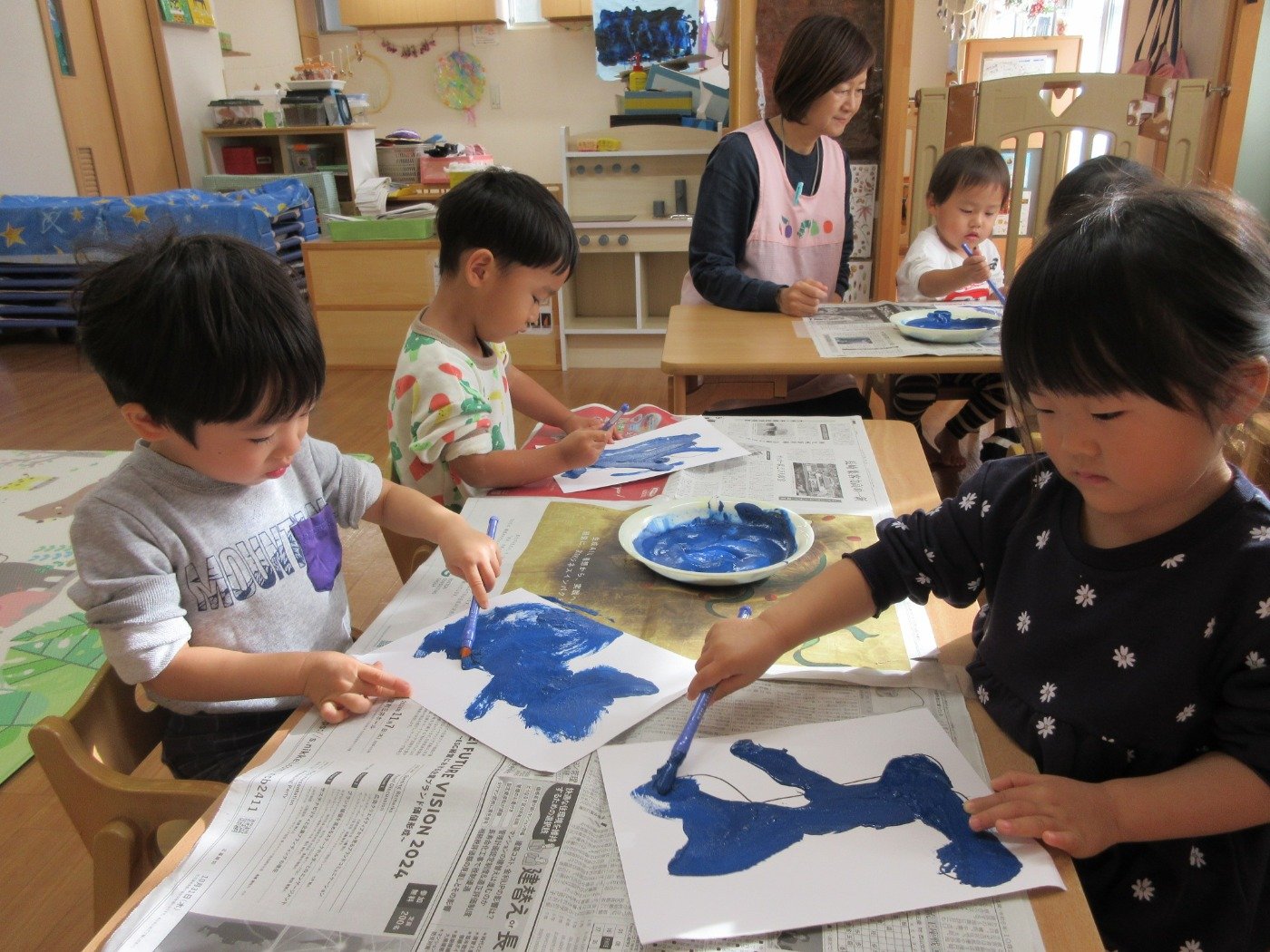 くま組さんはねこのピートの形を絵の具でぬりぬり。形を意識して塗りすすめているうちに、画用紙いっぱいにぬりぬり。ピートがかくれんぼしたね!