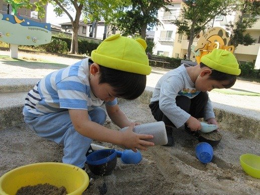 もちろん、どこの公園にいっても大好きな砂遊びはかかせません♪ひんやりした砂や、あたたかい砂を小さな手のひらで感じながら夢中で遊んでいますよ。