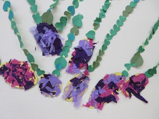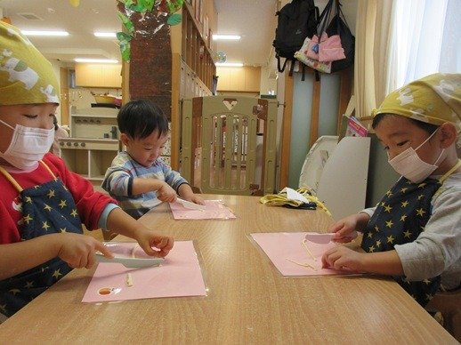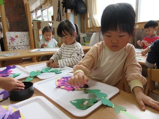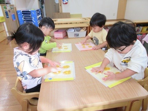 指先につけた糊を、広い面に塗り広げることにチャレンジ!ちぎったお花紙をくっつけて、おいしそうなお芋ができあがり。♡の形の葉っぱもいっぱいつけて作ったんですよ。