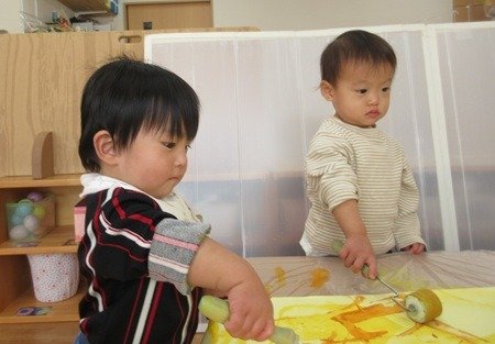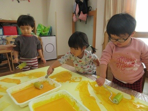 今日は黄色の絵の具。大きな画用紙の端から端までコロコロ コロコロ~♪