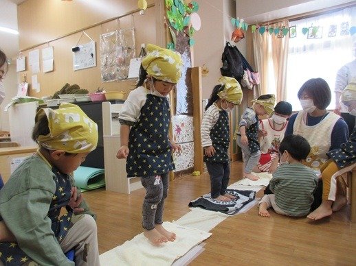 順番にフミフミタイム!「〇〇ちゃん がんばれ!」応援しあいながらフミフミ。どう?できたかな?