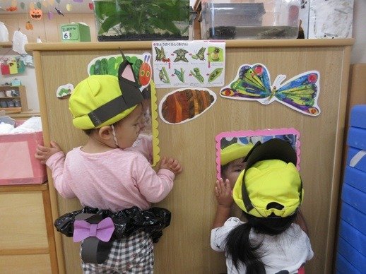 「あ!いた!!」「ほんとだ!いたね!!」絵本のキャラクターを見つけて大喜びでかけよりました。