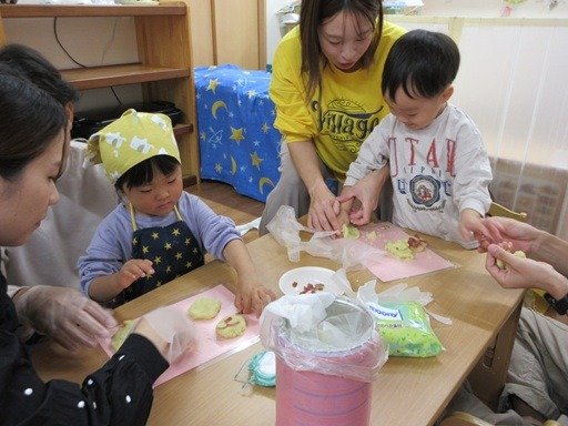 ハロウィンの朝はクッキー作りからスタート。くま組さんは好きな型でくりぬいて、