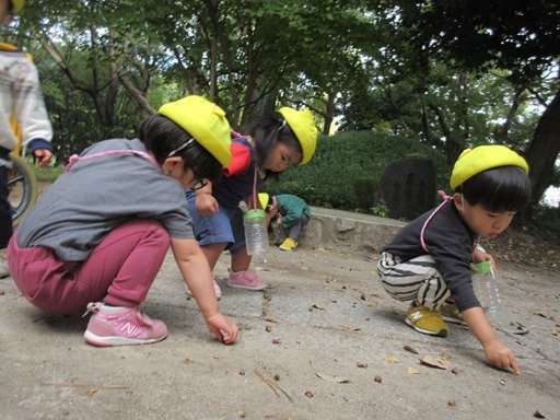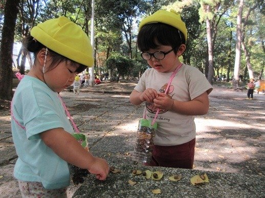 公園で秋の実探しに夢中な子どもたち。落ち葉や枝もたくさん集めて