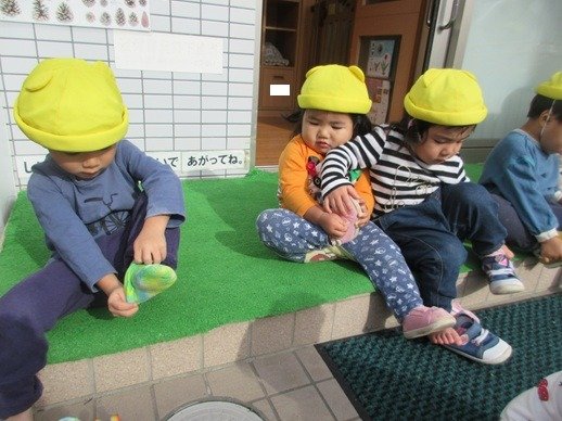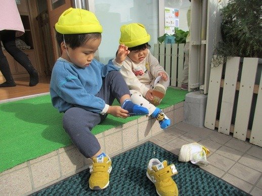 うさぎ組さんは、靴、靴下をはくのを頑張っています。ひよこ組さんも”自分でやりたい”という気持ちが育つように、手を添えながら見守っています。くま組さんは脱いだ洋服をたたんで片付けることが習慣になるように見守りながら、一人ひとりに合わせて声をかけているところです。苦戦することもありますが「できたー!」「あってる?」「すごいね!」「やったー!」嬉しい声が聞こえてきます。”できるようになる”より、”できるようになりたい”という気持ちが育ってほしいです。