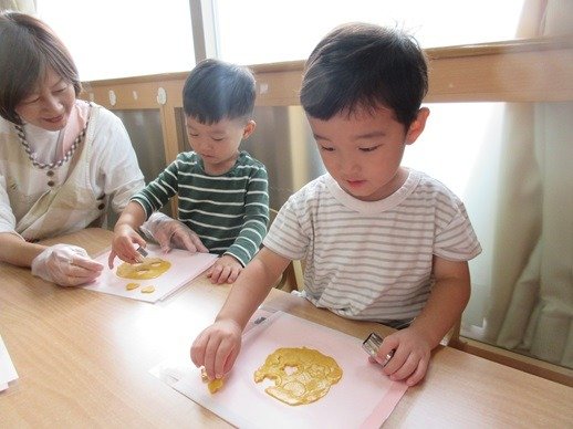 ダシにするカツオやこんぶの香りをかいだりして、3時のおやつを楽しみにして過ごしました。