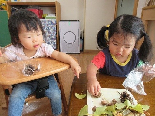 1歳児クラスのお友だちは目の黒目を描くのにもチャレンジしました。宝物がいっぱい詰まった大きなどんぐりさんができあがり。