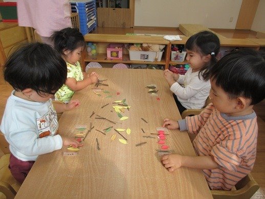 1歳児クラスのお友だちは枝をきれいに並べていたり、葉っぱの画用紙の色を揃えたいとこだわりも。0歳児クラスのお友だちは、枝を貼り付けて、またはがしての繰り返しを楽しみながらの製作です。