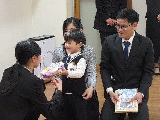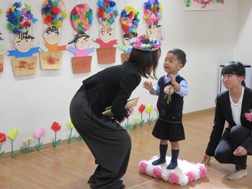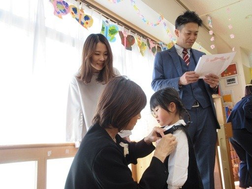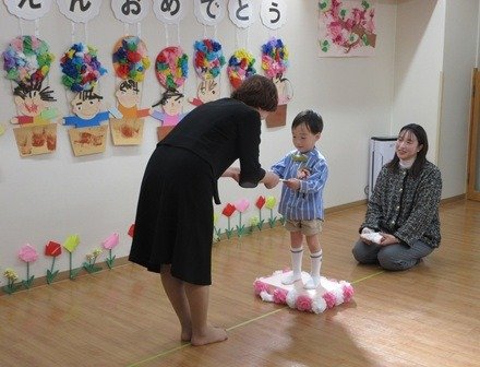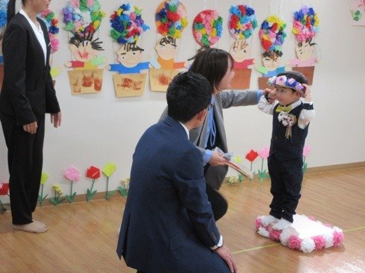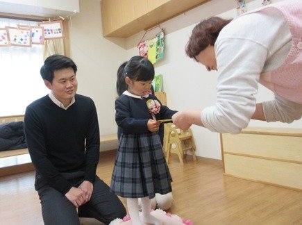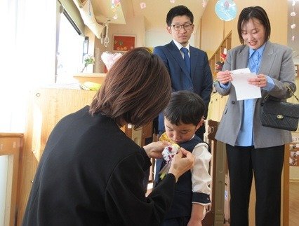 今日はおめかしをしてみんなでお祝いです。くま組さんは主役だね。胸にコサージュをつけてもらって卒園式のはじまりはじまり。