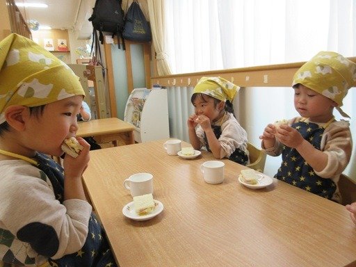 自分で作った卵サンドのお味はいかが?大きなお口でパクリと食べて「おいしい!!」