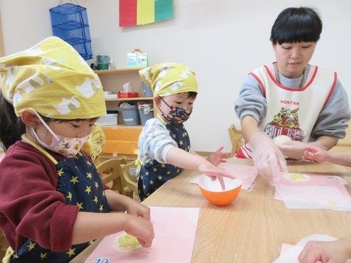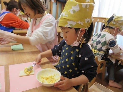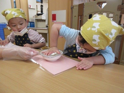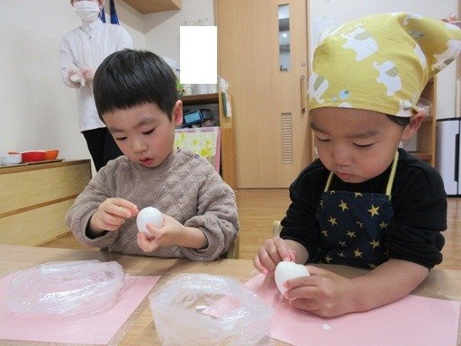 くま組さんはクッキングで卵の殻むきに挑戦。コンコンとヒビを入れてペリペリ。小さいのが取れたね、大きいのが取れたね。手に殻がついちゃったなんてお話しながら、最後までむいてみると、つるん♪とした茹で卵に「かわいい」となでなで。