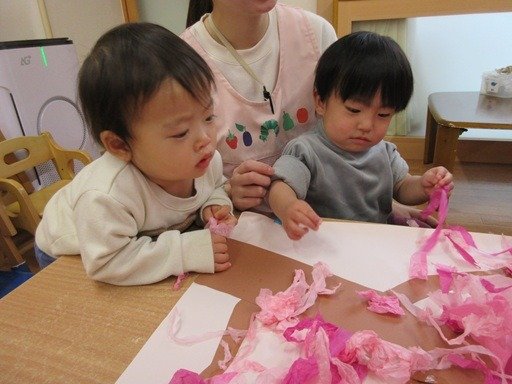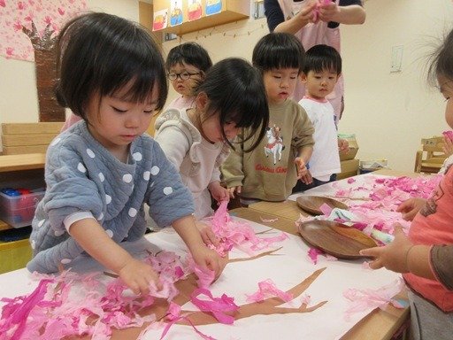 お花紙をちぎってペタペタと貼ってできたのは梅の花。ふんわり優しい香りが漂ってきそうでしょ?
