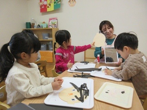 鏡を見ながら髪の毛を貼りお顔のパーツを貼りました。よく鏡を覗き込んで「目はここ」「髪の毛はこんなんになってる」と、観察上手なくま組さん。ほんと、よく似てるね!とビックリです。