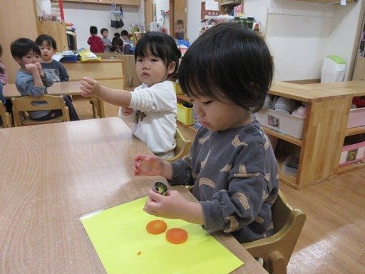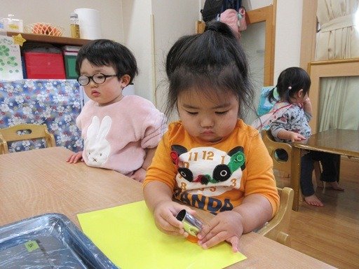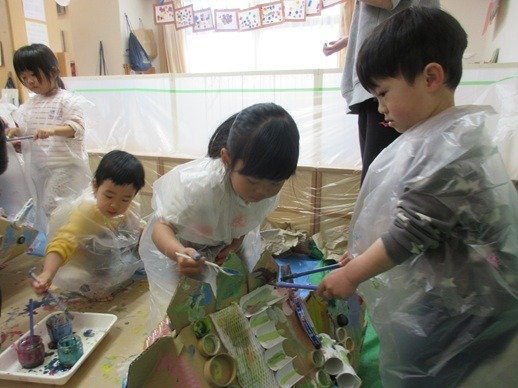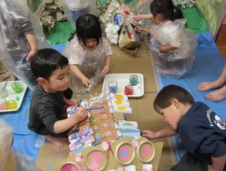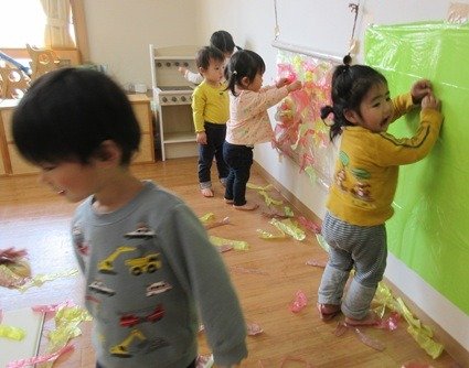 テープの芯の丸いところ、プチプチ、卵パック、ガタガタの紙、筆、ローラー、スタンプとそれぞれの塗り心地を確かめている子どもたち。