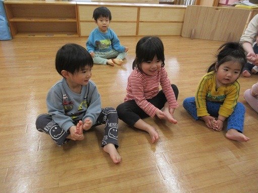 それから、一人でも。足の裏をトントン叩きながら♪かじやのかっちゃん♪と歌います。片足を持ち上げるしぐさは意外と難しいもの。足の裏の刺激にもなるので、ぜひお家でも楽しんでほしいわらべ歌の一つです。