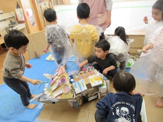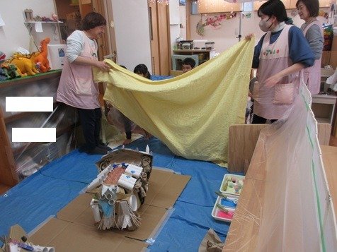 廃材を貼り付けた恐竜さん。この丸いところはどんな風に塗ってくれるかな?卵パックのようなはじくものはなんて言うだろう。