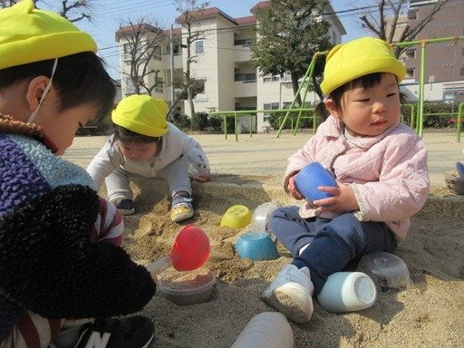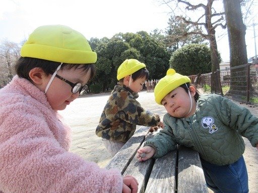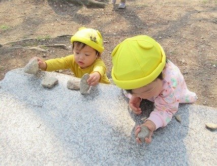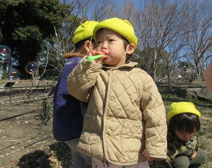 公園につくと、追いかけっこにハンターごっこ、大好きなシャボン玉、それから…石や木の実、木の枝を集めたら、お友だちと分けっこして、一緒に遊ぶのが大好きです。
