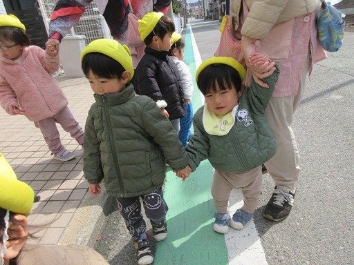 ひよこ組さん(0歳児)のお友だちも手を繋いでお散歩に。1年の成長を感じます。うさぎ組さん(1歳児)は、もうすぐくま組さん(2歳児)という気持ちでいっぱいです。頼りになりますよ。