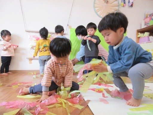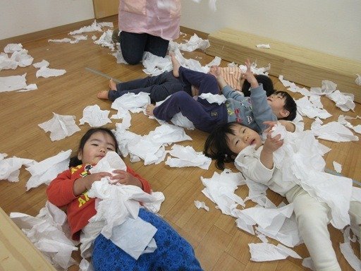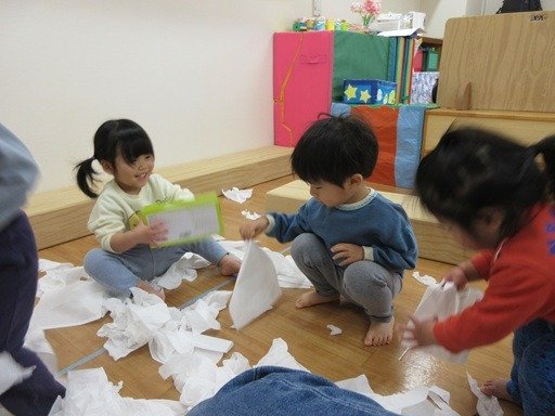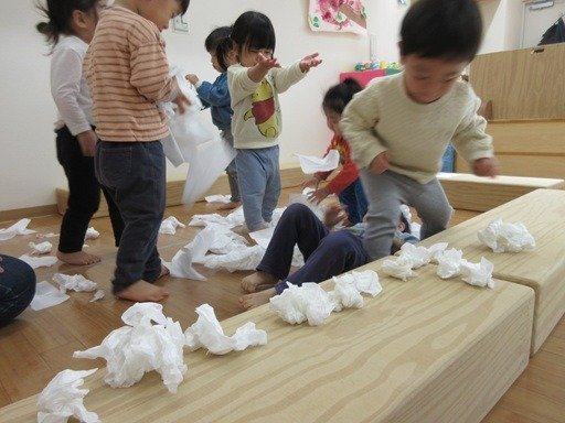 ティッシュをいっぱい出してひらひらひら~。箱からいっぱい出してひらひらひら~。ニッコリ笑顔が楽しそう。
