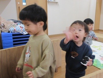 そんなうさぎ・ひよこ組さんは、月曜日からお部屋を移動しました。そうです、くま組さんが使っていたお部屋にお引越し。「ばいばーい」「いってらっしゃーい」