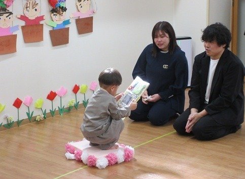 自分で作った写真たてには、一緒に過ごしたくま組さんの集合写真を入れました。「ありがとう」ちゃんとお礼も言えます。大きくなりましたね。
