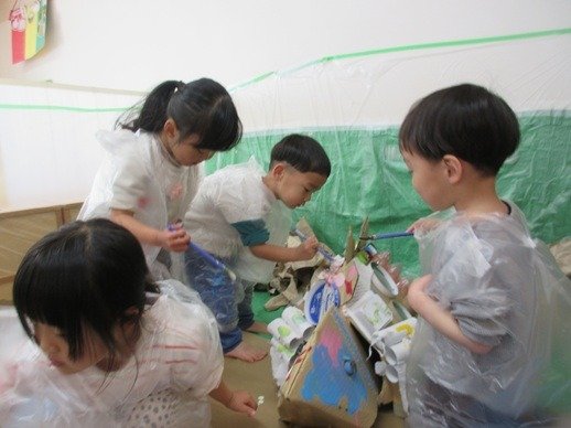しばらくすると手足に塗ったり壁に描いたりしながら♪きょうりゅうごっこ♪と朝の体操の歌をうたいながら塗り始めていました。
