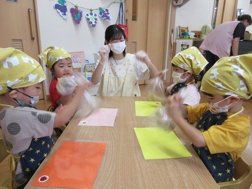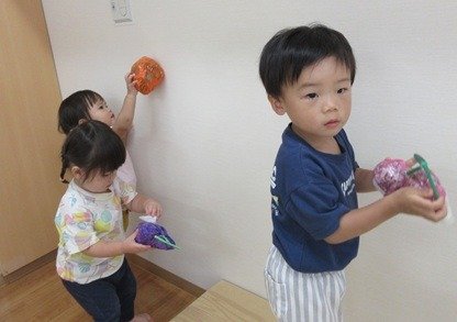 9月はまだまだ暑くて、絵の具や石鹸、ゼリーなど、水を使って遊んだ前半。後半になって少し公園に行ける日が増えてきたものの暑さはいつまで続くの?なんて毎日でしたね。
