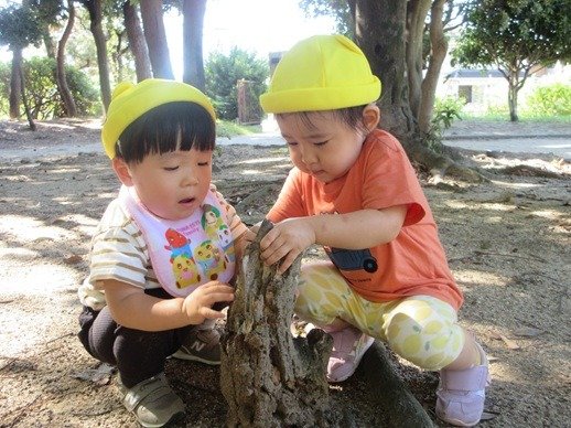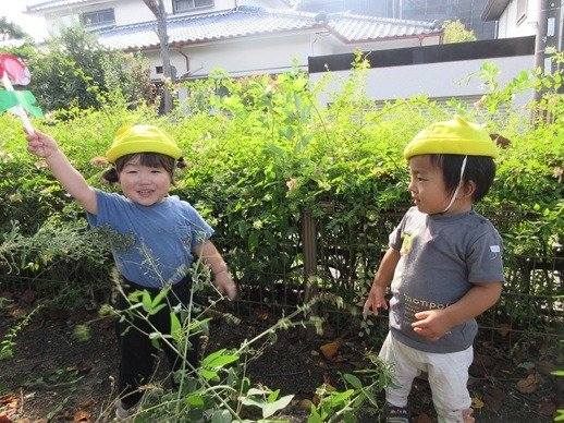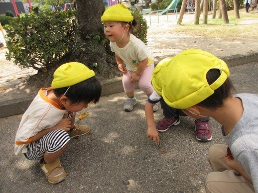 大きなバッタも見つけましたよ。お友達が捕まえると、自分も触ってみたい!捕まえてみたい!と、チャレンジの気持ちがムクムク湧いてくるようですよ。明日はどんな生き物に会えるかな?