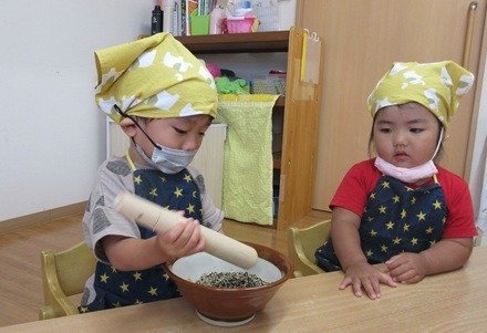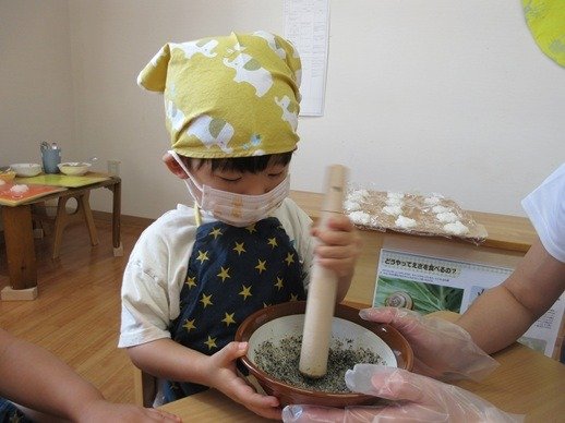 大きなすり鉢をすりこぎを使って、ゴマをすります。ゴリゴリ ゴリゴリ。とってもいい香りがしてきて、早く食べたくなっちゃったね。でも、グッと我慢。