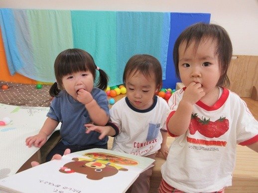 絵本を見ているお友達。「あ~ん。パクッ」かわいいしぐさがいっぱいです。おいしそうに食べるお顔がたまらないですね!
