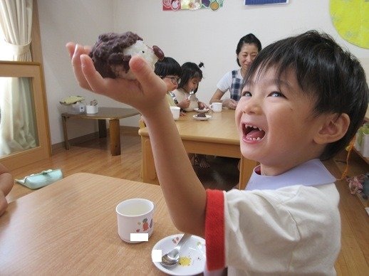 3時のおやつはお月見団子。ハリネズミのかわいさにこの笑顔。「かわいいから食べれな~い」なんて手のひらにのせてかわいがっていました。喜んでくれて先生達も嬉しいな。