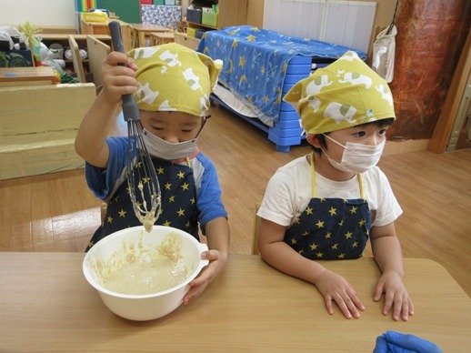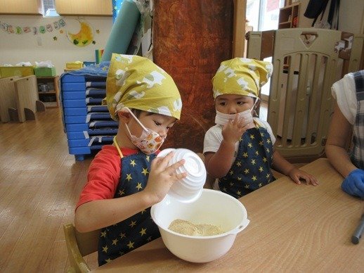 くま組さんはクッキングもしましたよ。今月のクッキングは小麦粉から生地を作っていきます。