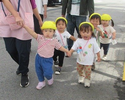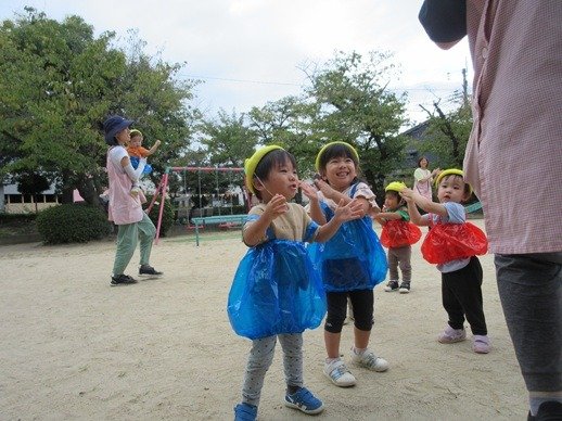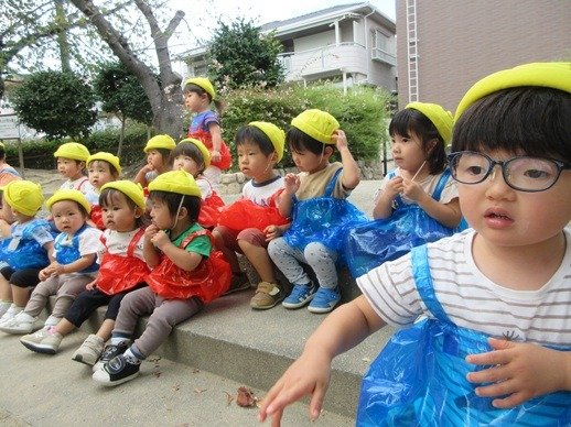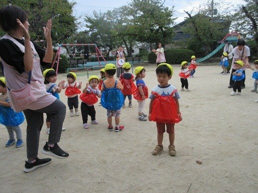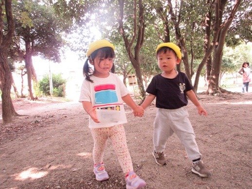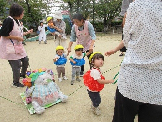 10月10日はあきまつりでした。お昼寝から起きた子どもたちはぐりとぐらに大変身。近くの公園まで”えんそく”に出発!