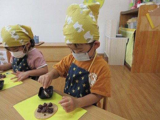 焼けた生地にあんこをのせますよ。たっぷりのせたらおいしいよね!
