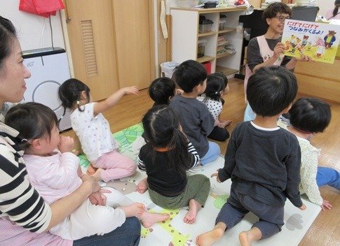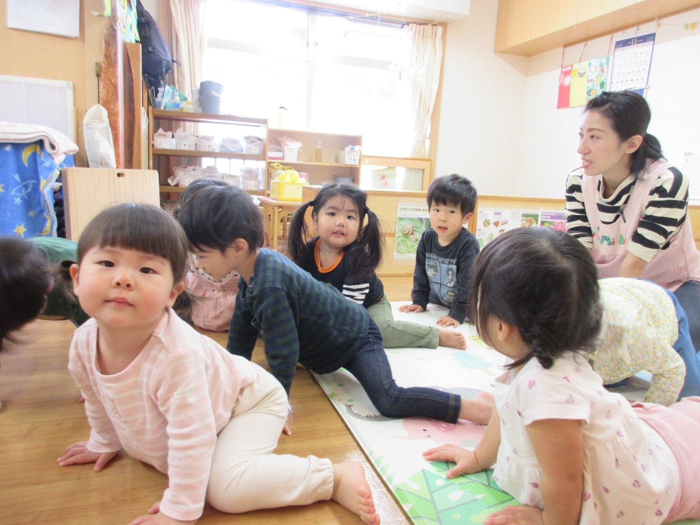 地震・津波の避難訓練を行いました。だんごむしのポーズが良い時もあればそうでない時もあるようで、今回は『カエルのポーズ』を覚えました。手のひらをしっかり開いて床にペタリ。足も開いて踏ん張るポーズです。