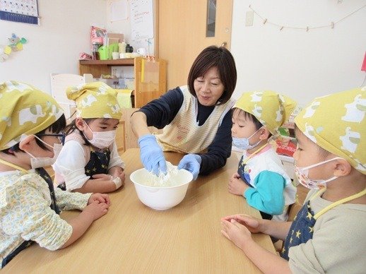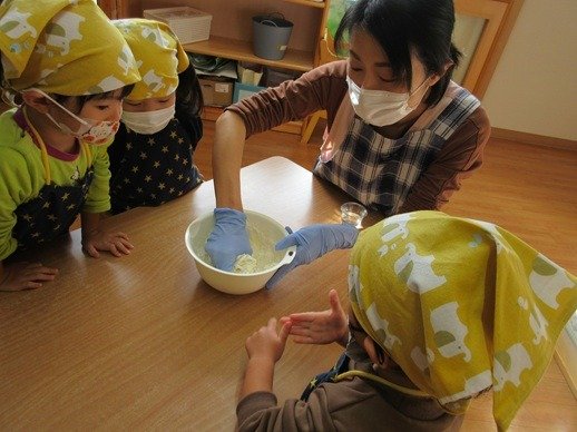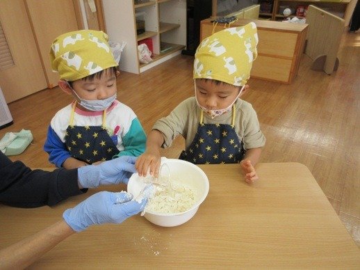 子どもたちが粉と水を入れて、こねこね。くま組のクッキングは”うどん作り”