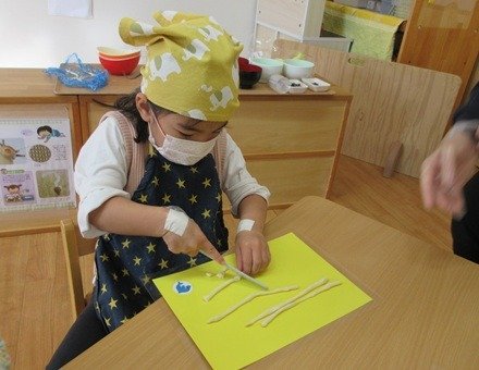 のばした生地をチョッキンチョッキン。包丁の使い方も上手でしょ!