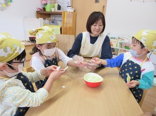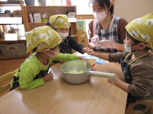 おうどんに入れる白菜をちぎってお鍋にいれるよ。みんなでやると楽しいね!
