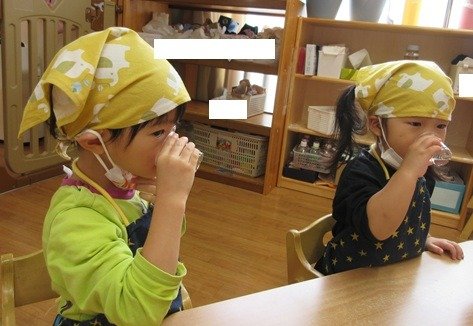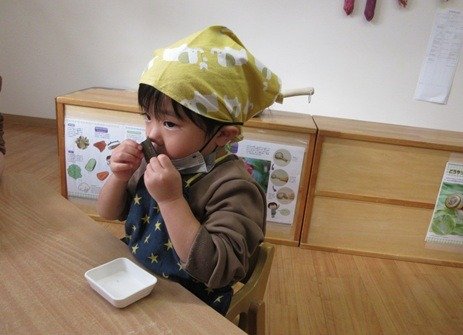 昆布と鰹節のお出汁はとってもいい香り。「飲んでみたい?」「飲みたい!!!」と子どもたち。少しずつお味見をしてみました。「おいしい♪」嬉しそうなお顔がかわいいです。