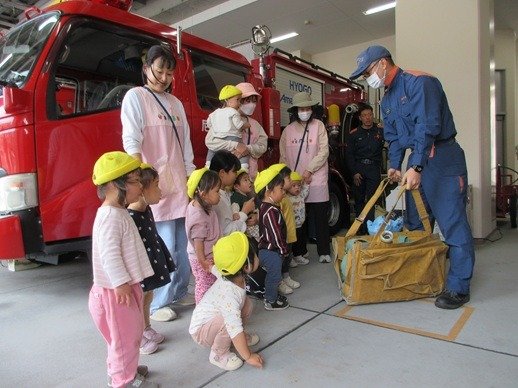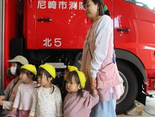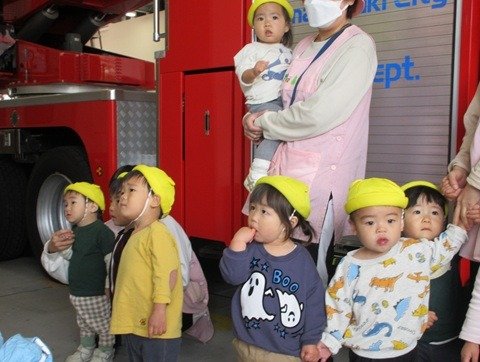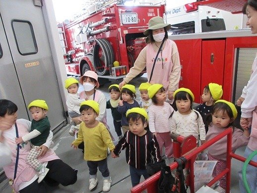 大きなはしご消防車を見上げて「おっ!おっ!」と指をさして、大興奮のお友達。ちょっとびっくり、ドッキドキのお友達、興味いっぱいでキョロキョロのお友達。