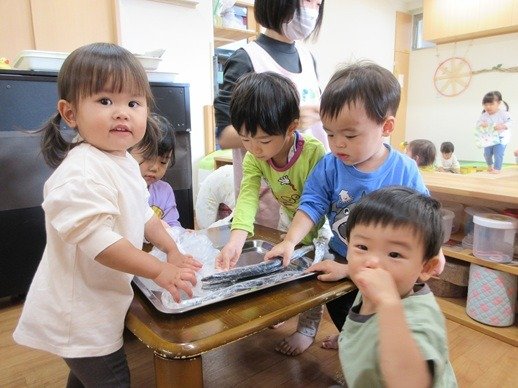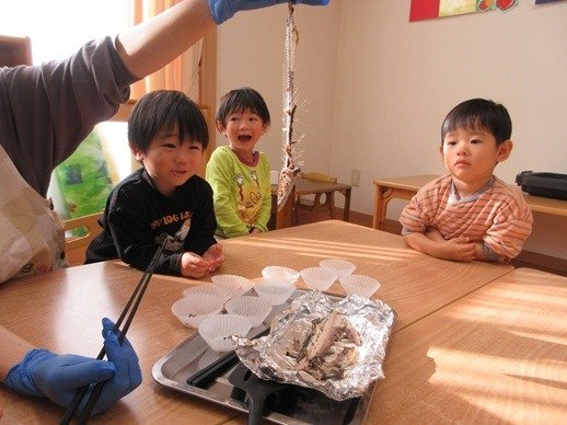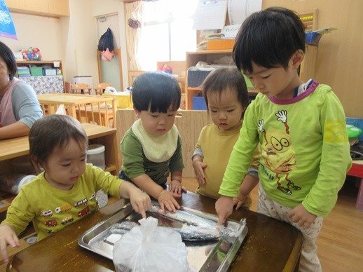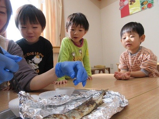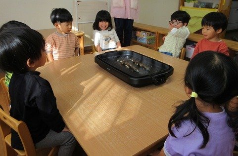 くま組さんは、サンマを焼いてみました。お部屋がいい香り~。ホットプレートの蓋をとると、「うわぁ~」と子どもたち。
