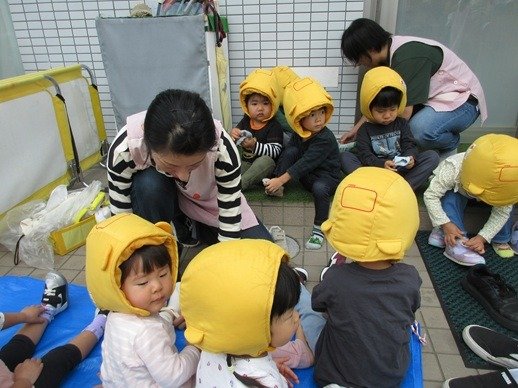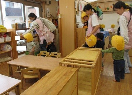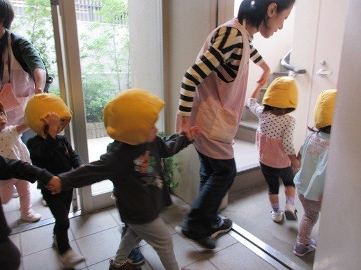 揺れがおさまったので、防災ずきんをかぶり保育園の外まで出ます。
