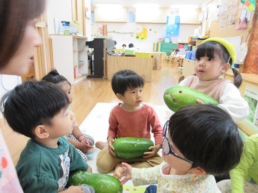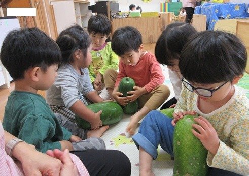 「これなぁに?「かたいよ」子どもたちが興味津々で集まり、叩いてみたり匂いを嗅いでみたり、抱っこしてみたりしているうちに、