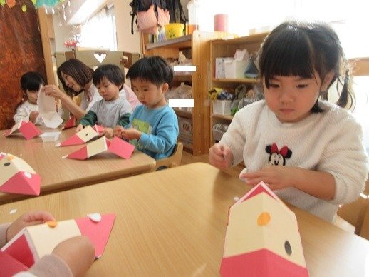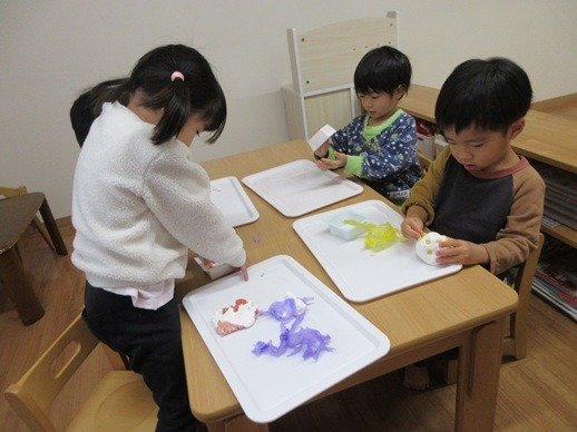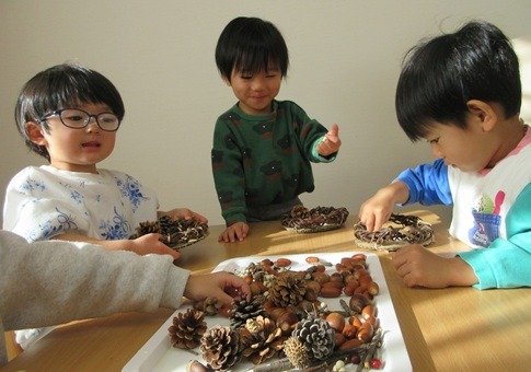 紙粘土に、小さくちぎって丸めたお花紙をギュッと詰め込んで飾りにしているお友達。考えたね!木の実や小枝をさして、今年も『どんぐりケーキ』を作りました。毎年少し変えながら作っていますが、同じものを作り続けると、成長が分かって良いですね!