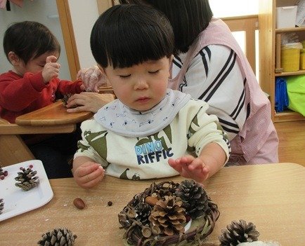 拾ってきたどんぐりや松ぼっくりを使って作るリースは、さつまいものツルを土台にしたリース。赤い実がかわいい!と、小さな指先でつまんではチョンチョンと並べて、とっても可愛らしくできあがりました。