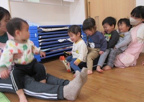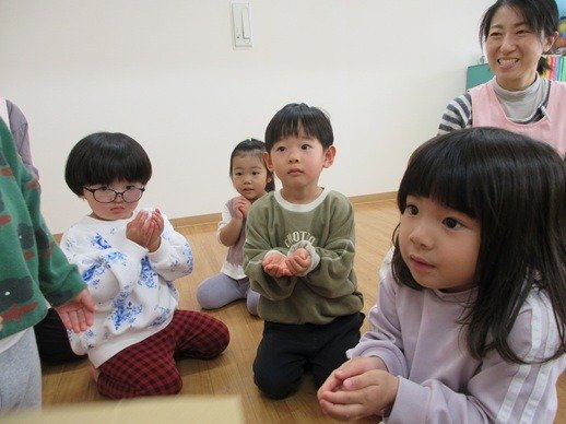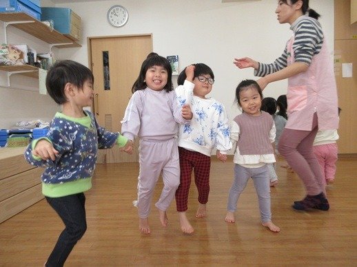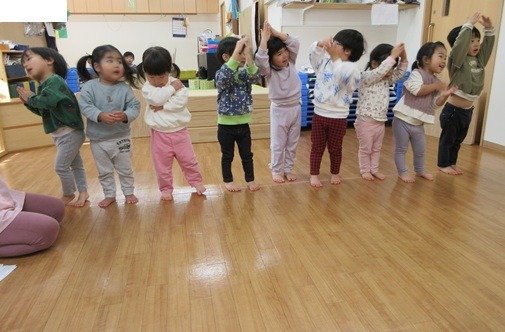 たいようのお友達は、先生と子どもたちだけでやってみるので、保護者の方はかわいい姿を目に焼き付けていただきたいです。もしも「パパも・・・」「ママも・・・」となったらご一緒に。でも、できるだけ、こんな風にお友達と楽しめる姿をみてもらいたいなーと思ってます。