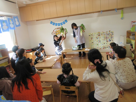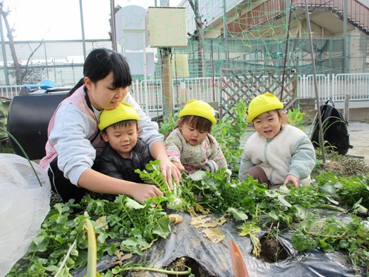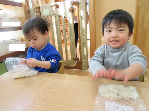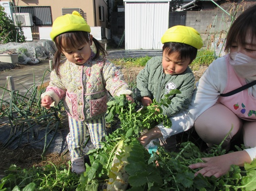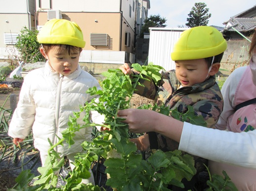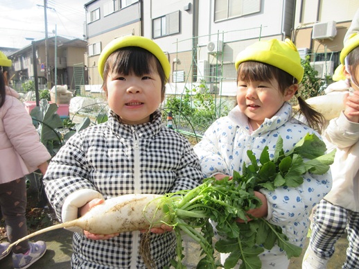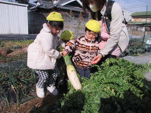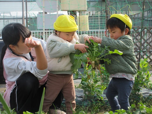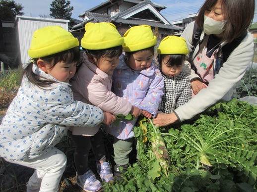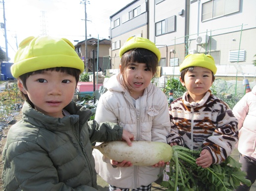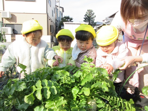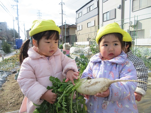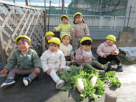 さて、2月も残りあと数日です。保育園では卒園、進級の準備を始めています。それから、食べつくした大根も、蕪と大根の食べ比べをして、皮のきんぴらを作っておわりです。次回はその様子をお伝えしますね。