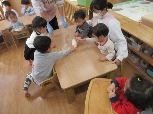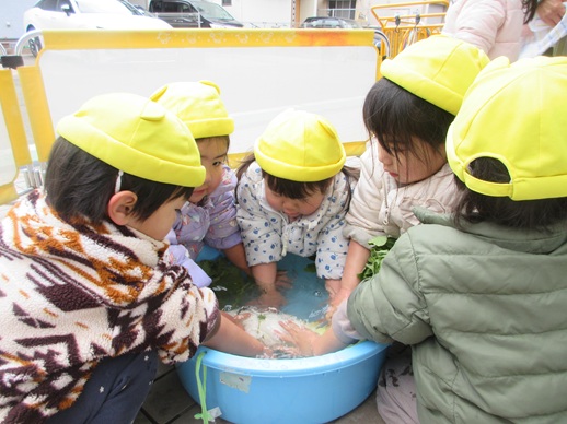 5日目は、うさぎ組さんとひよこ組さんの体験です。大根を触ってみるよ。ひんやりつめたいね。ツルツルしていて気持ちいいね!