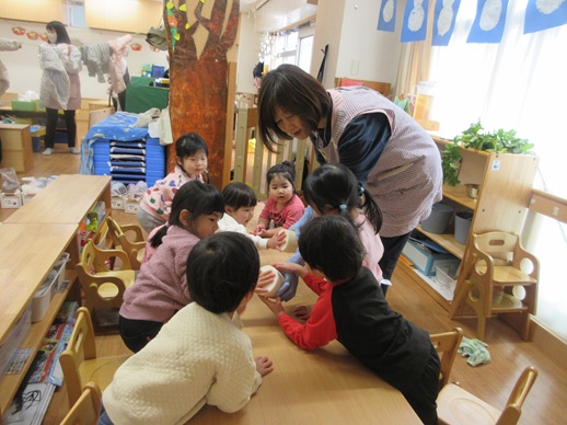 青と緑の風船鬼たちがお部屋いっぱいにやってきていたのですっっっ!!どうしよう、どうしてやっつけようか・・・。やっつける方法はね、ボールを当ててやっつけるよ。「おにはそと、ふくはうち」だよ。子どもたちは一斉にボールを取りに行って鬼をめがけて「エイッ」